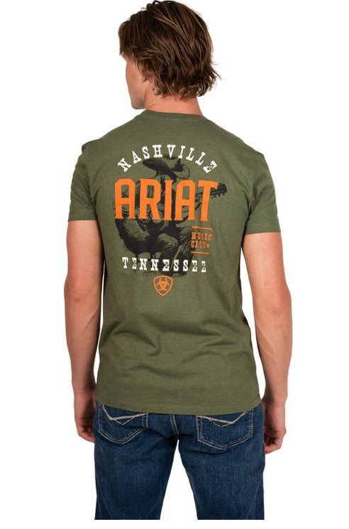 • Large back graphic: cowboy guitarist with NASHVILLE, ARIAT, MUSIC CITY, and TENNESSEE text