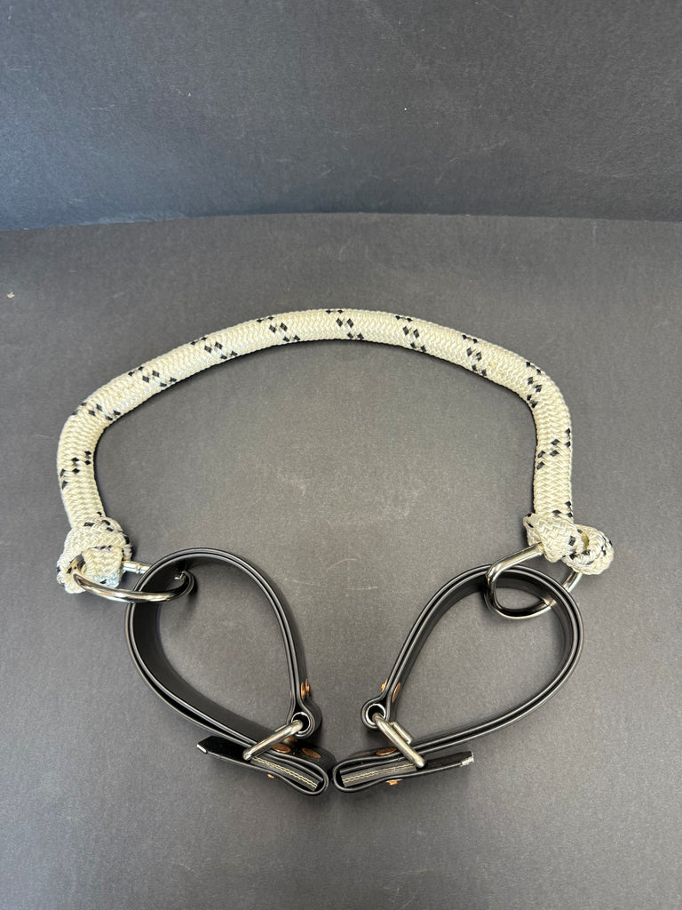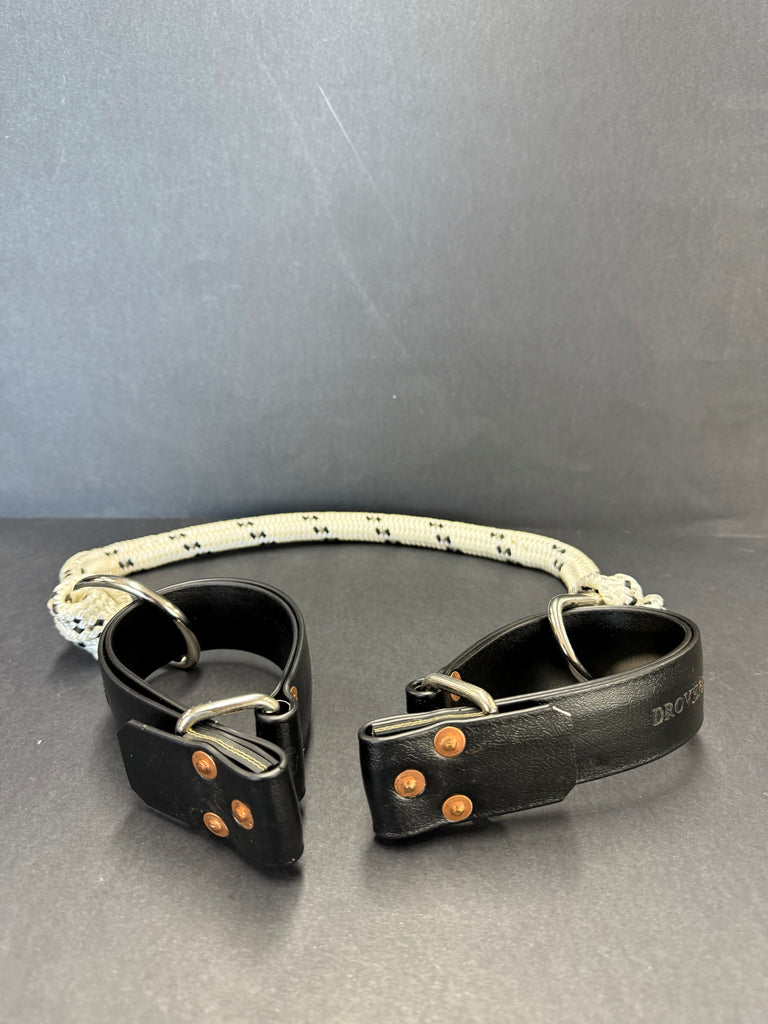 Drovers Saddlery Made Quick Release Adjustable PVC Side lines are constructed from 1 1/2" PVC sewn together for extra strength and durability. These sidelines have a loop (slip through loop) on end for hind fetlock, buckle for adjustment in the middle and front loop has a quick release fitting to enable getting on and off easily and quickly. These hobbles are designed to run from front leg to back leg or diagonally.