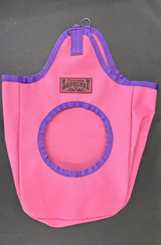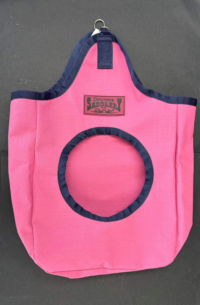 Fully bound around the top edge of the hay bag which gives strength and eliminates the hay bag stretching out of shape. Has two dees at the top to be hung by. Also features a tab at the bottom of the bag to support the bag should it need anchoring down.