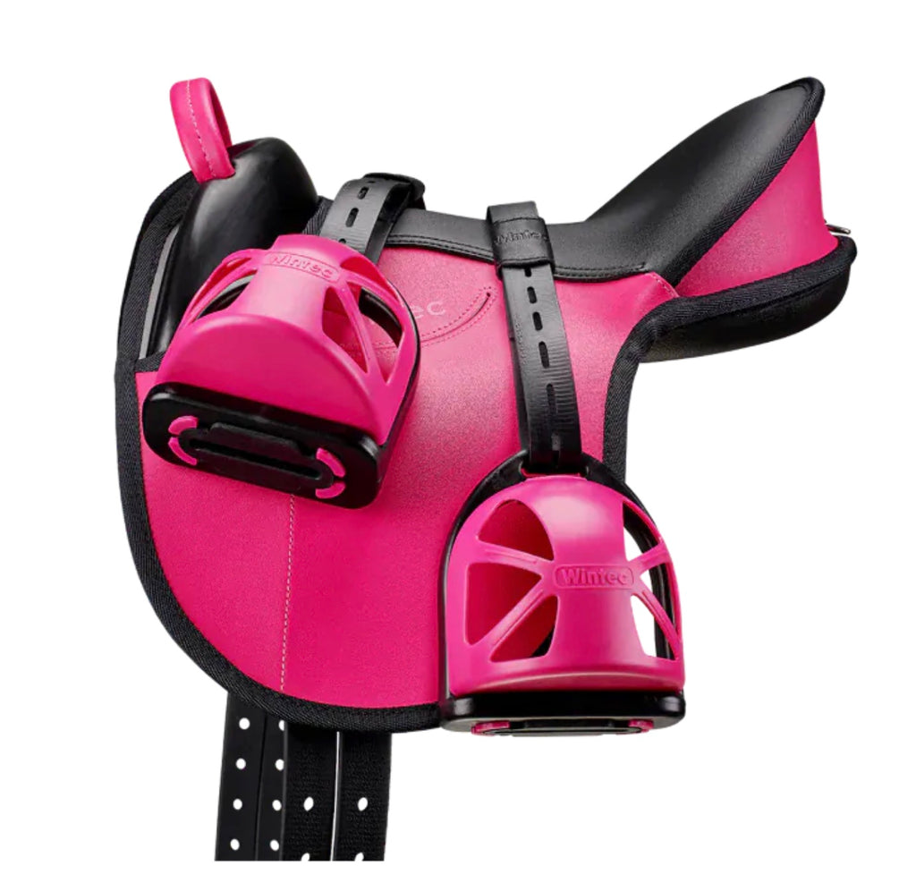 This package combines the Wintec Kids Saddle Pack, the complete solution for beginning riders! This package combines the Wintec Kids saddle, Wintec Kids Webbers, and Wintec Kids Cage Stirrups for a safe, comfortable riding experience. The saddle features a secure handle and movable panels, while the Webbers provide close pony contact. The cage stirrups ensure secure foot placement with a grippy tread. Give your child the best start with the Wintec Kids Saddle Pack!